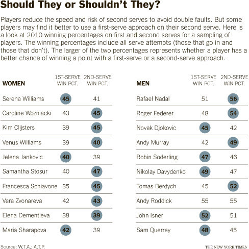 The data suggest that players should serve big on the second serve as well as their first. And distinguished psychologist and Nobel Prize winner Daniel Kahnemann offers an explanation: