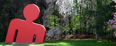 A hot day in Boston. What could be better than a trip to the leafy sculpture garden at the DeCordova Museum? Try to help the red man climb out of the Earth. Build dams in the stream in the Rain Gates. Tap on the Two Black Hearts to see if they hollow. Try to take out the stovetop espresso maker embedded in one of the hearts.